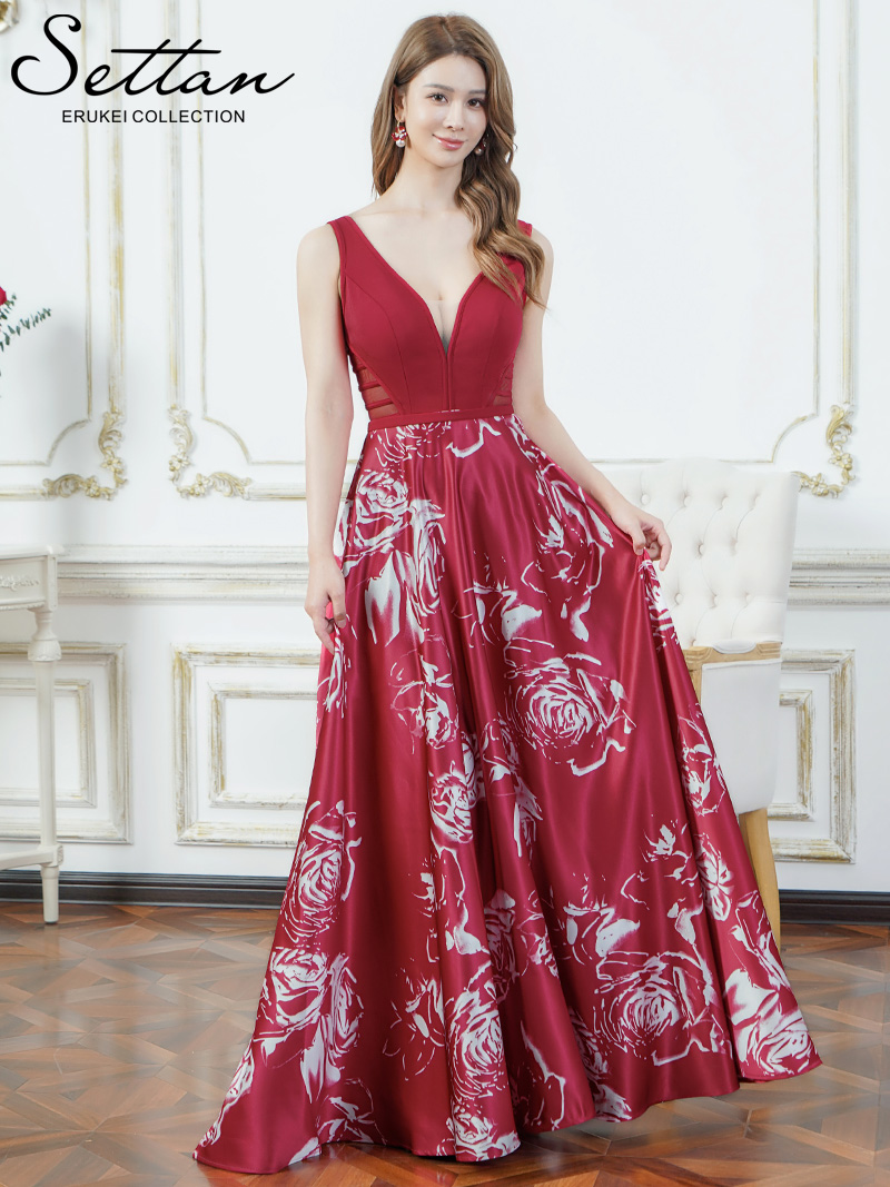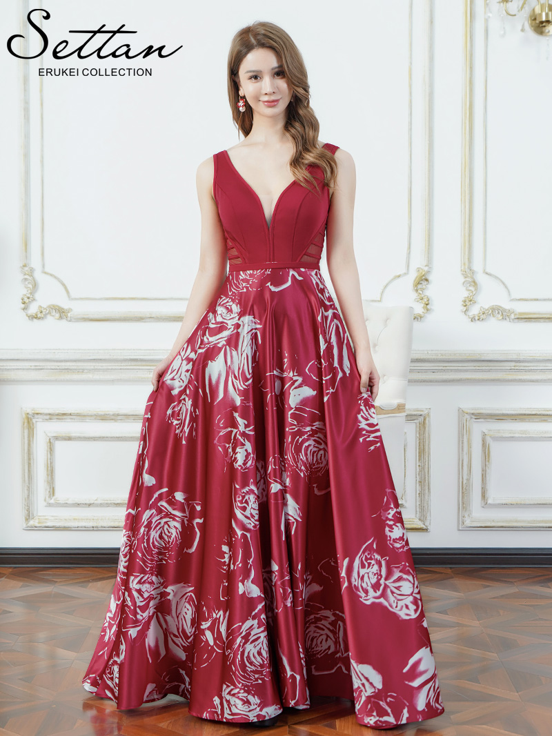 [送料無料][SETTAN]ブラック×ホワイト・ワインレッド×ホワイト・薔薇・花柄・プリント・サテン・セクシー・シースルー・ノースリーブ・Aライン・ロングドレス[即日発送][大きいサイズあり] [S36509]