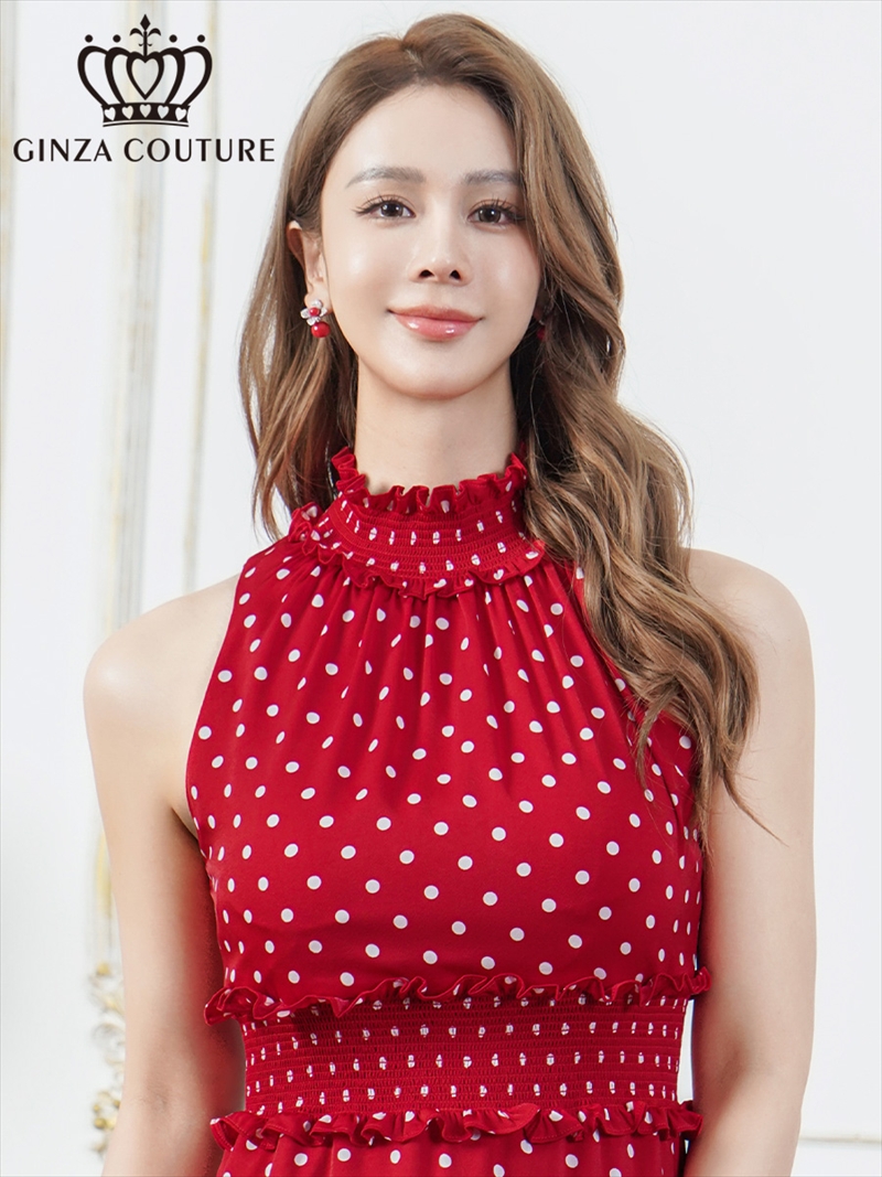 [送料無料][GINZA COUTURE]レッド・レッド×ホワイト・ホワイト・ブラック×ホワイト・ロイヤルブルー・ドット・花柄・プリント・ワンカラー・首元フリル・ウエストマーク・アメリカンスリーブ・ティアード・Aライン・ミニドレス・ワンピース[即日発送][大きいサイズあり] [C25129-2]