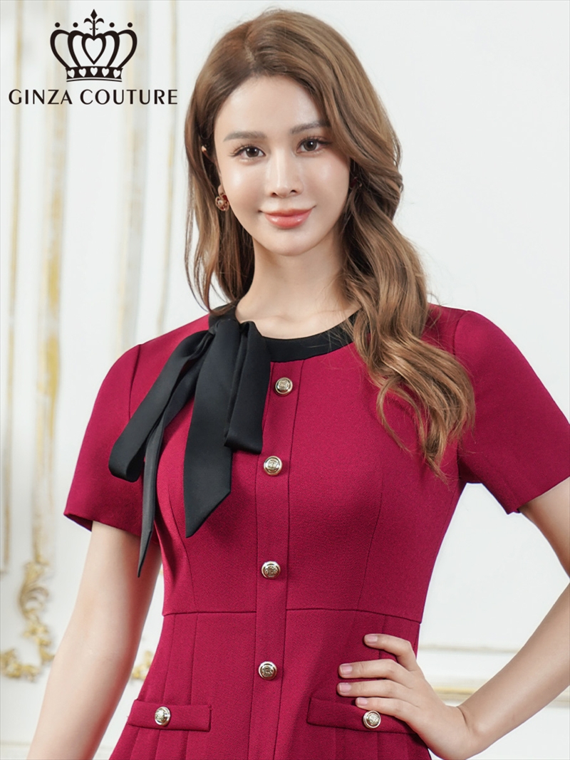 [送料無料][GINZA COUTURE]レッド・ピンク・イエロー・アイボリー・ネイビー・グレー・バイカラー・半袖・Aライン・リボン・ボタン・シンプル・ミニドレス・ワンピース[即日発送][大きいサイズあり]