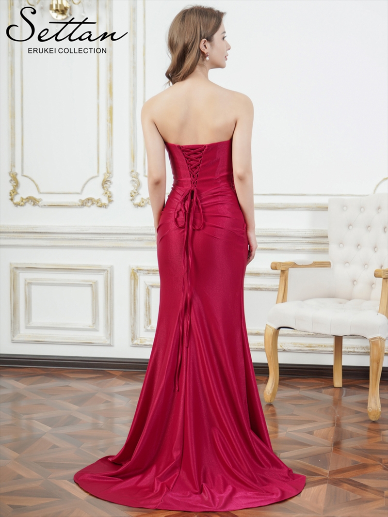 [送料無料][SETTAN]レッド・ベージュ・ブルー・シャイニーサテン・アシンメトリー・ベア・タック・スピンドル・スリット・ストレッチ・タイト・マーメイド・ロングドレス[即日発送][大きいサイズあり]