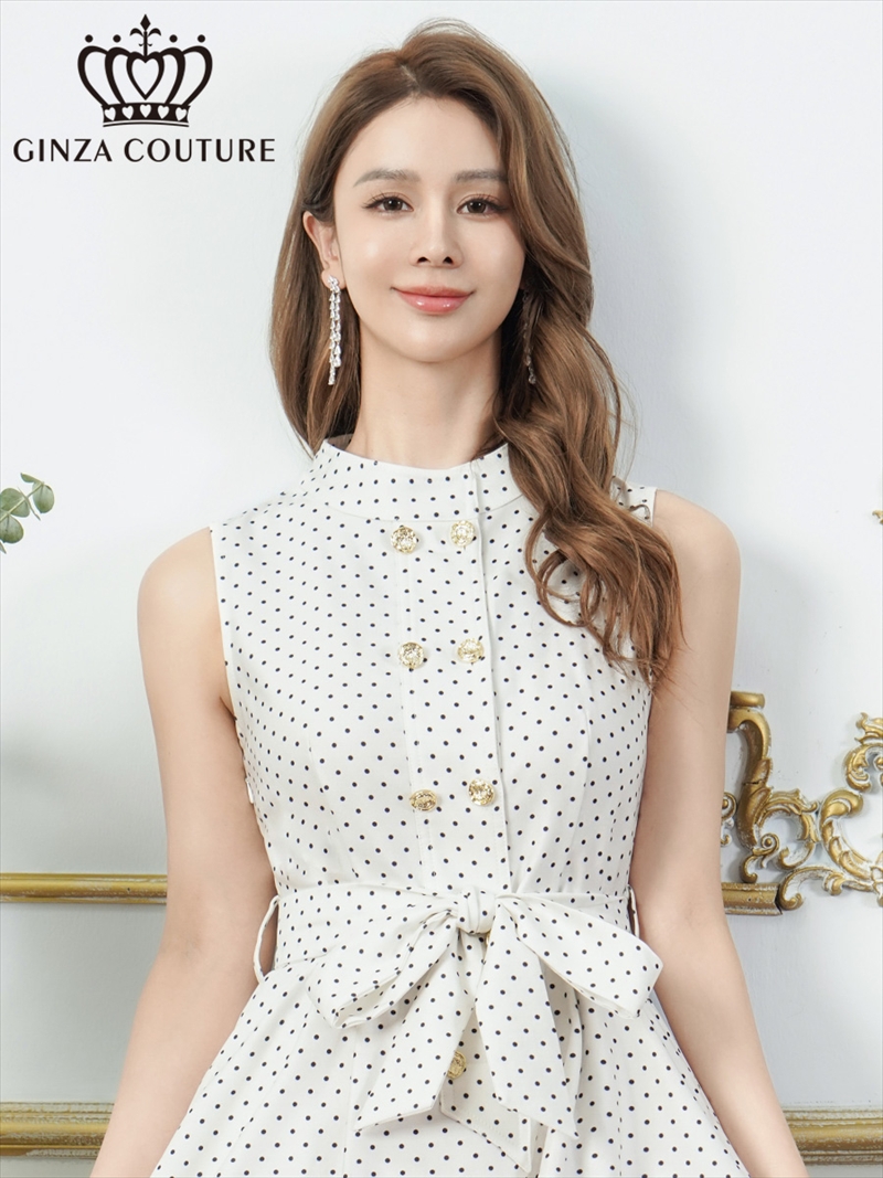 [送料無料][GINZA COUTURE]ホワイト・グリーン・ドット・金ボタン・ポケット・リボンベルト・ノースリーブ・Aライン・ミディアムドレス・ワンピース[即日発送][大きいサイズあり]