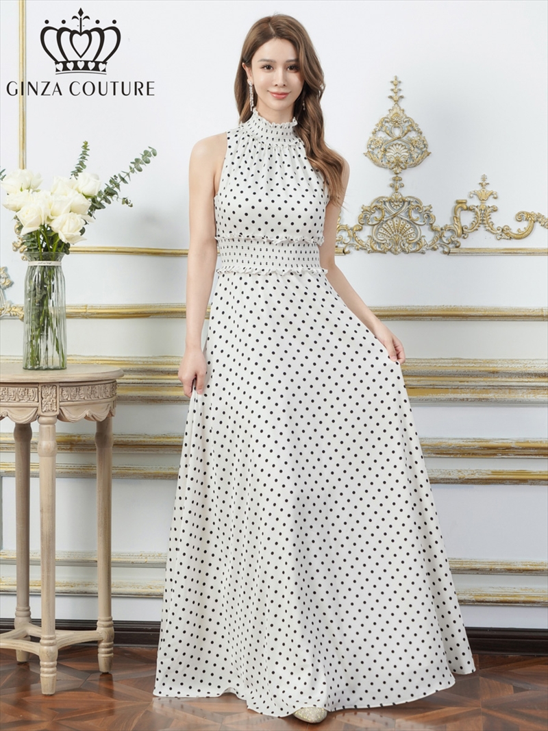 [送料無料][GINZA COUTURE]ホワイト×ブラック・レッド×ホワイト・ドット・首元フリル・ウエストマーク・マキシ・アメリカンスリーブ・Aライン・ロングドレス[即日発送][大きいサイズあり]