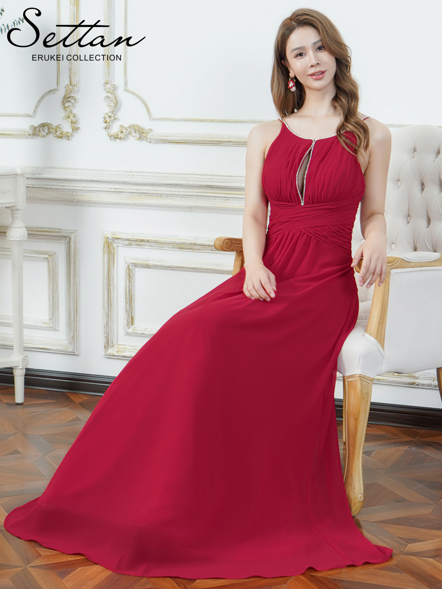 [送料無料][SETTAN]レッド・ホワイト・イエロー・ワンカラー・シフォン・胸元カット・ラインストーン・キャミソール・エレガント・Aライン・ロングドレス[即日発送][大きいサイズあり] [lk-S35115-1]
