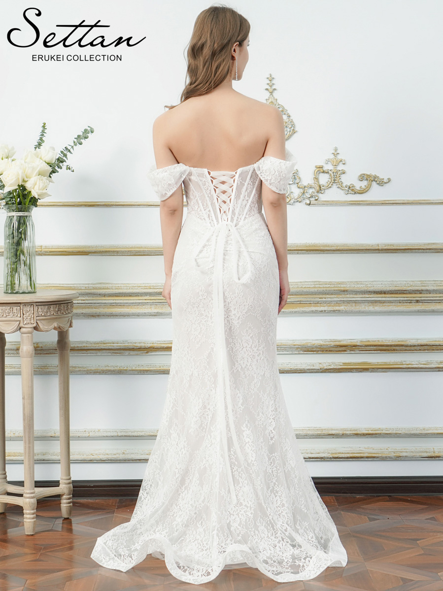 [送料無料][SETTAN]ホワイト・レッド・総レース・オフショルダー・コルセット風・スピンドル・シアー・ギャザー・スリット・タイト・マーメイド・ロングドレス[即日発送][大きいサイズあり] [S37220-1]