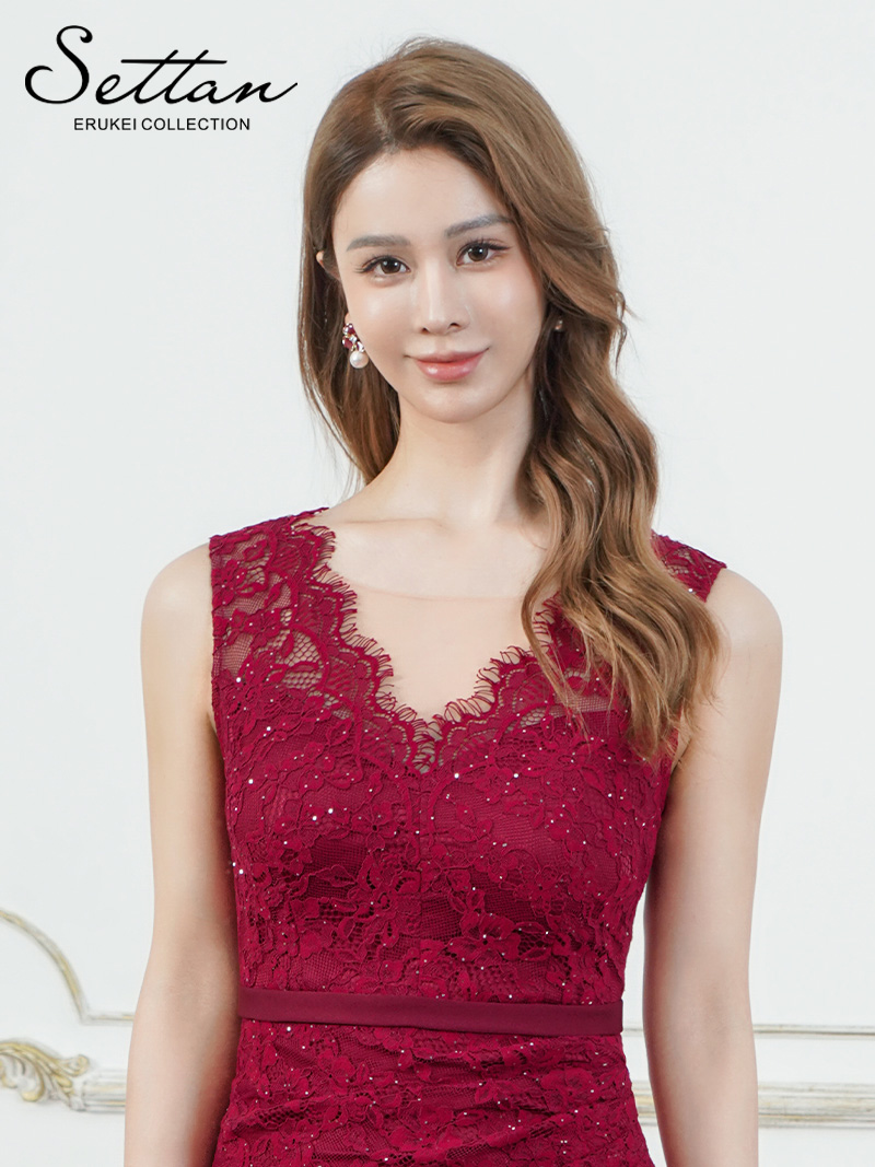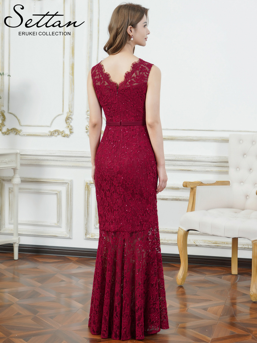 [送料無料][SETTAN]レッド・ホワイト・総レース・スパンコール・シアー・ギャザー・Vネック・ノースリーブ・ハイウエスト・タイト・マーメイド・ロングドレス[即日発送][大きいサイズあり] [S25141]