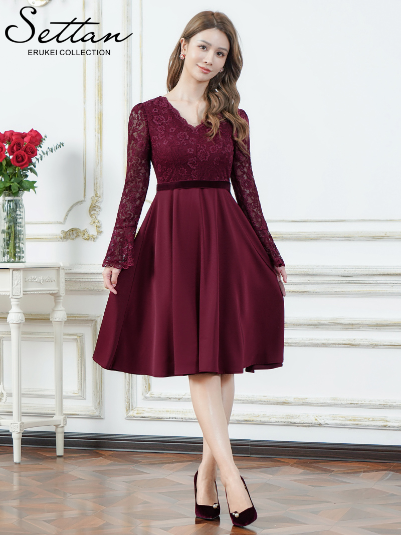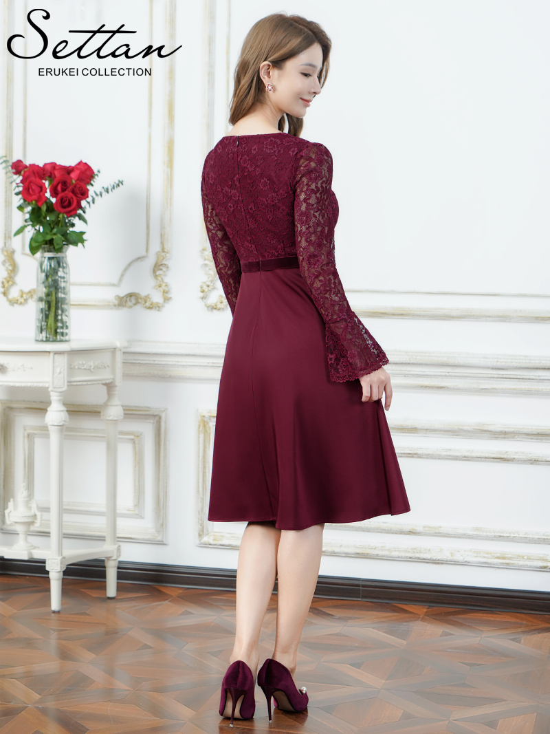 [送料無料][SETTAN]ワインレッド・ホワイト・ワンカラー・レース・サテン・Vネック・長袖・ベルスリーブ・ミディアムドレス・ワンピース[即日発送][大きいサイズあり]