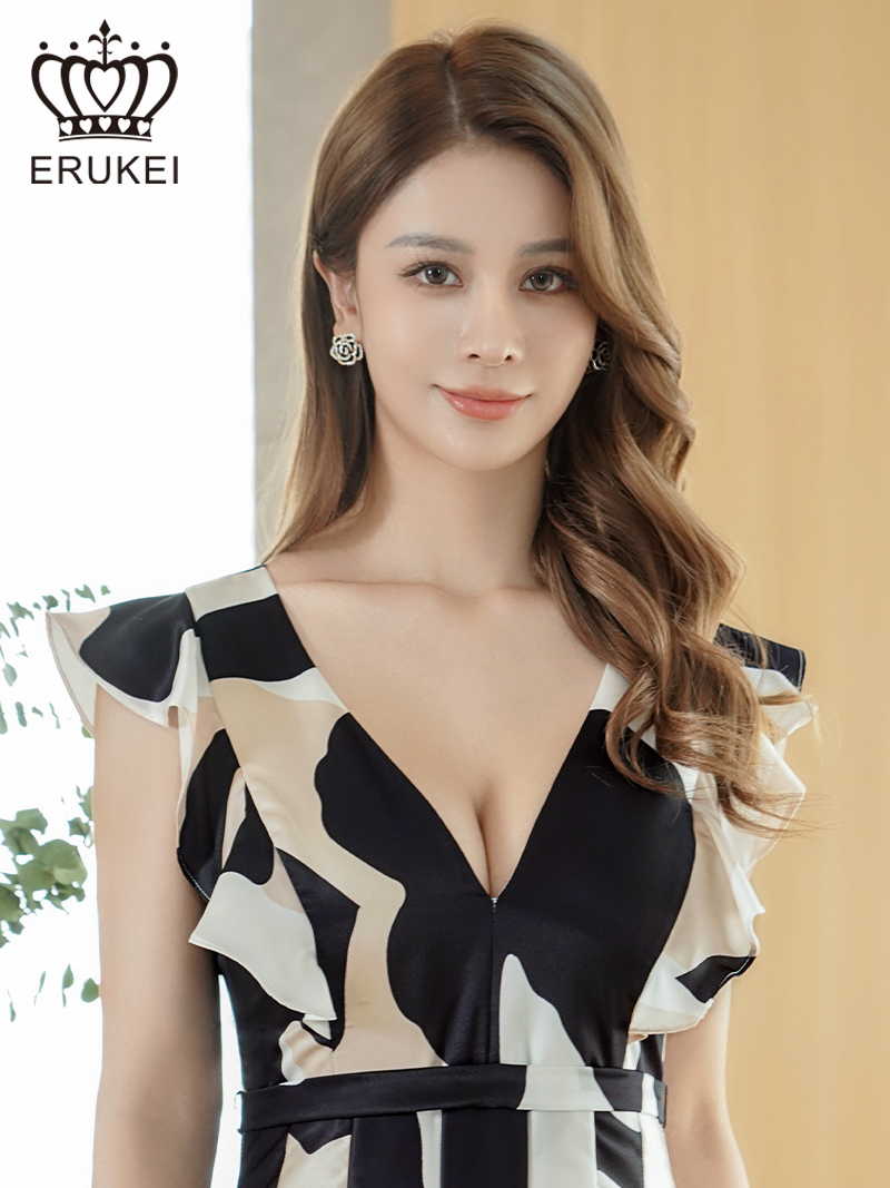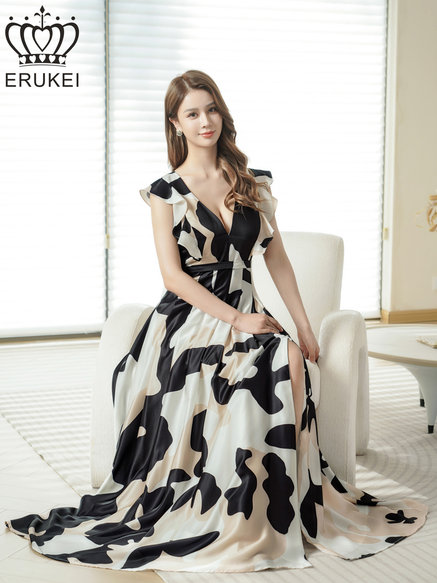 [送料無料][ERUKEI]ブラック×ホワイト・抽象柄・プリント・サテン・フリルスリーブ・Vネック・タック・ベルト風・スリット・Aライン・ロングドレス[即日発送][大きいサイズあり]