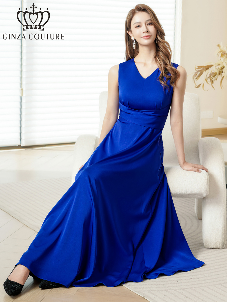 [送料無料][GINZA COUTURE]ロイヤルブルー・ホワイト・ワインレッド・サテン・シンプル・Vネック・ノースリーブ・ウエストマーク・Aライン・ロングドレス[即日発送][大きいサイズあり]