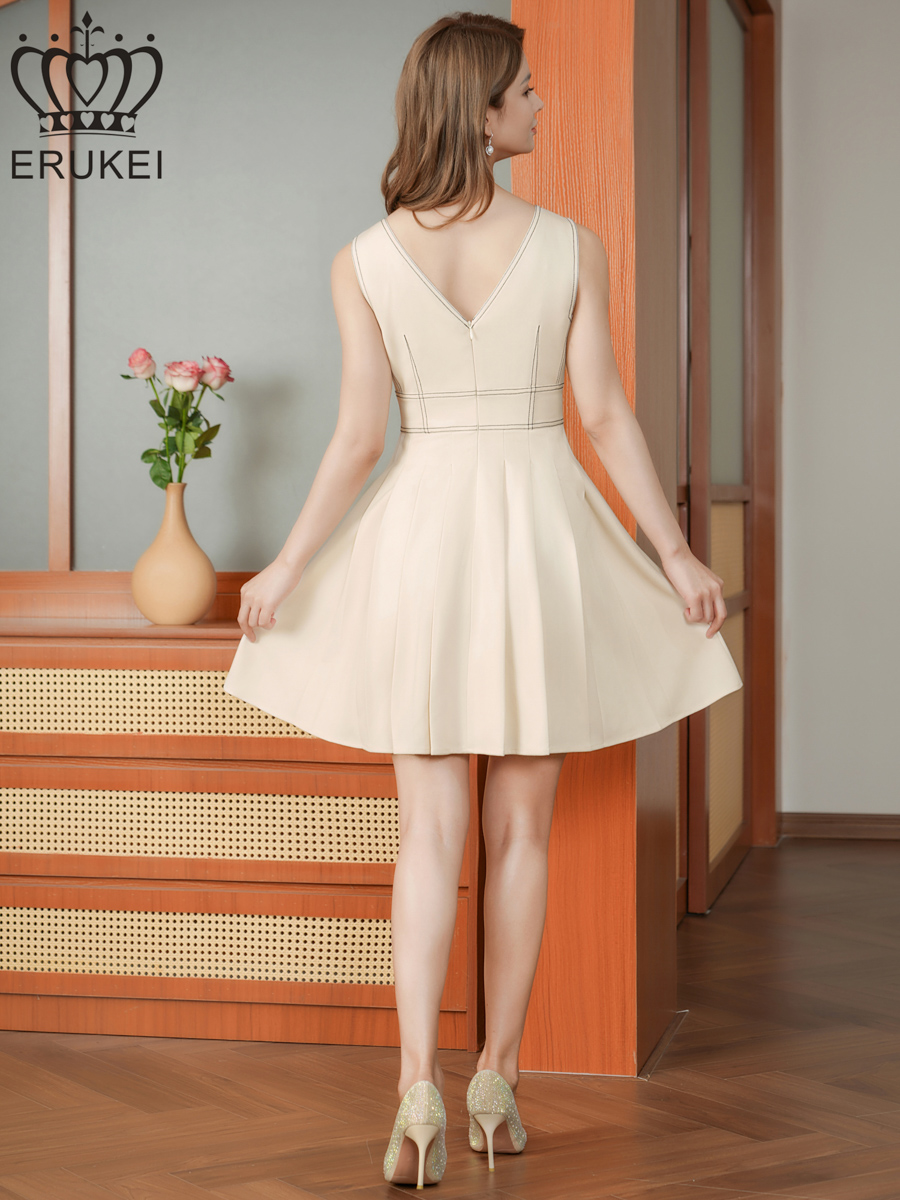 [送料無料][ERUKEI]アイボリー・ワンカラー・ステッチ・Vネック・ノースリーブ・プリーツ・Aライン・ミニドレス・ワンピース[即日発送][大きいサイズあり]