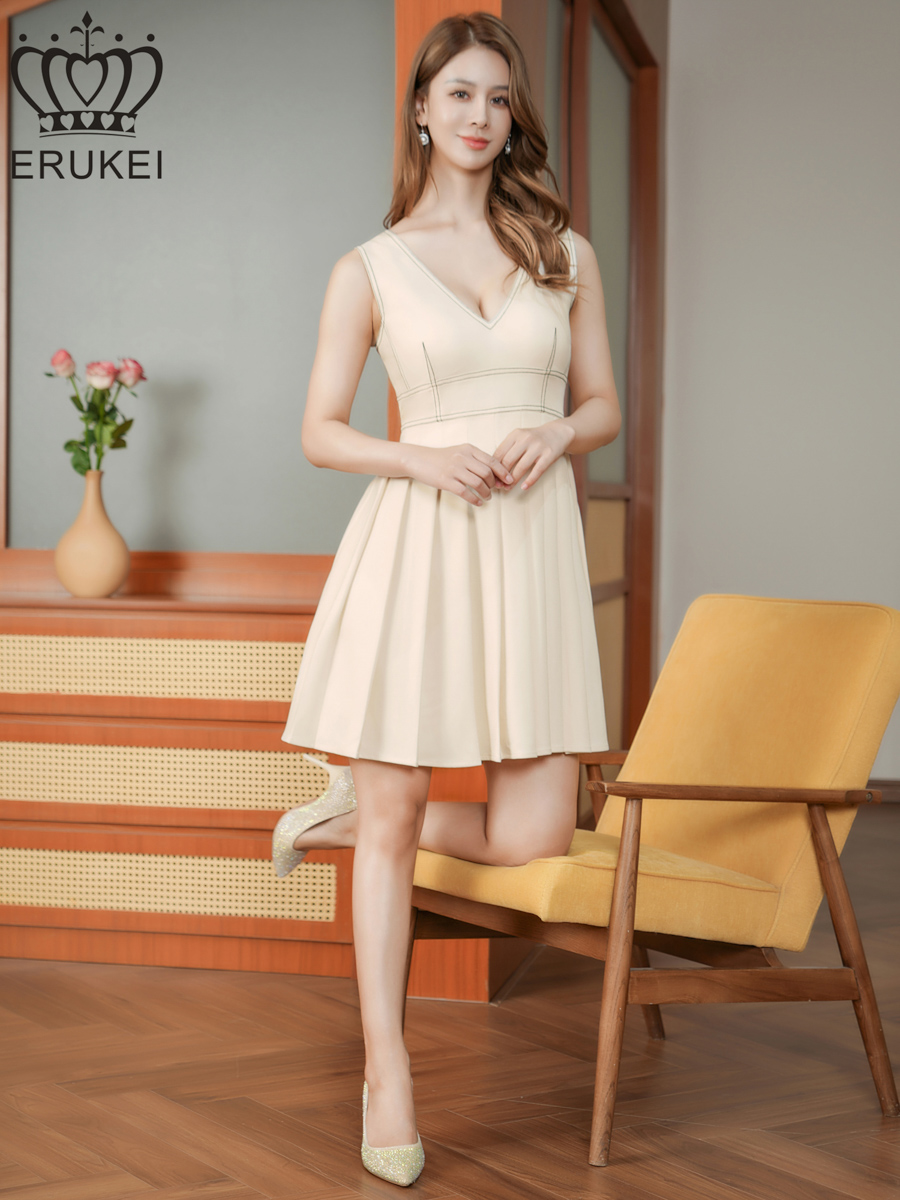 [送料無料][ERUKEI]アイボリー・ワンカラー・ステッチ・Vネック・ノースリーブ・プリーツ・Aライン・ミニドレス・ワンピース[即日発送][大きいサイズあり] [E25116]