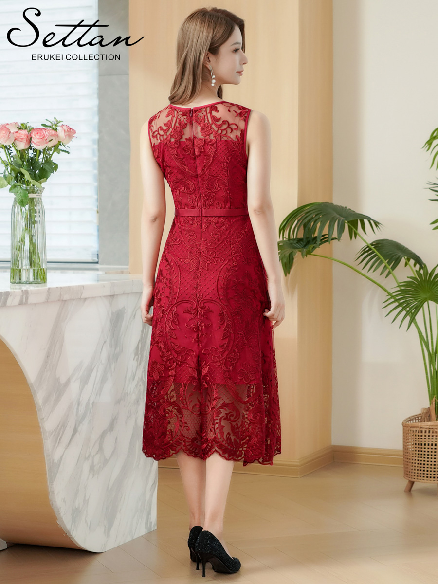 [送料無料][SETTAN]レッド・ブラック・レース・シアー・スカラップ・ノースリーブ・Aライン・ミディアムドレス・ワンピース[即日発送][大きいサイズあり]