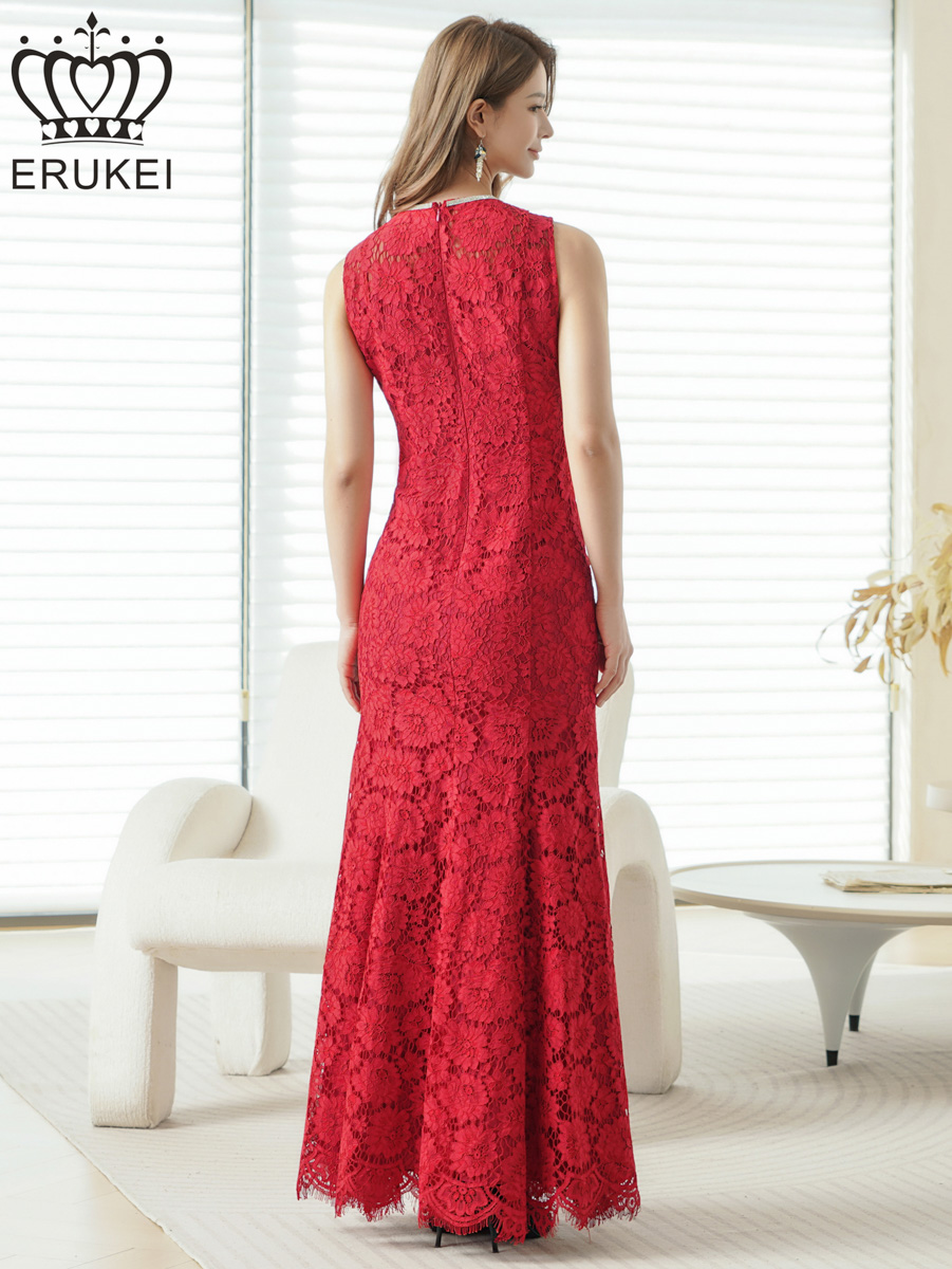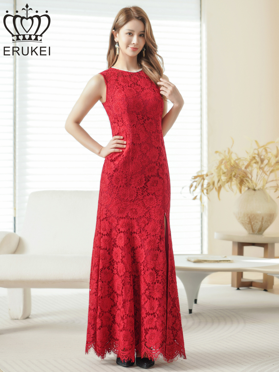 [送料無料][ERUKEI]レッド・ホワイト・総レース・ネックビジュー・ラインストーン・ノースリーブ・スリット・マーメイド・ロングドレス[即日発送][大きいサイズあり]