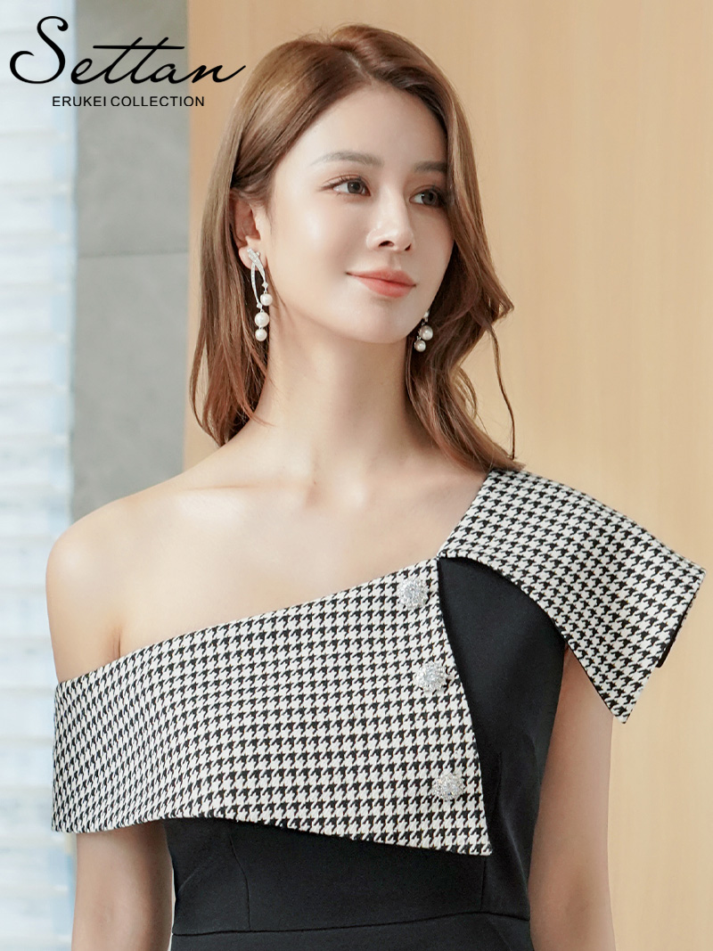 [送料無料][SETTAN]ブラック×ホワイト・千鳥格子柄・モノトーン・ビジューボタン・ワンショルダー・オフショルダー・タイト・ミ二ドレス・ワンピース[即日発送][大きいサイズあり] [S25277]