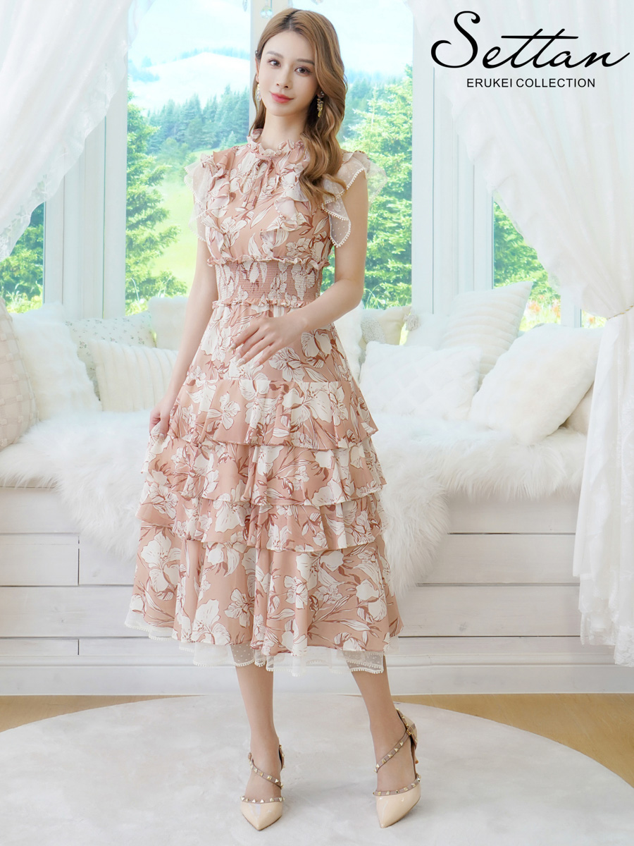 [送料無料][SETTAN]ピンク×アイボリー・花柄・シフォン・フリルスリーブ・プチハイネック・ティアード・Aライン・ミディアムドレス・ワンピース[即日発送][大きいサイズあり]