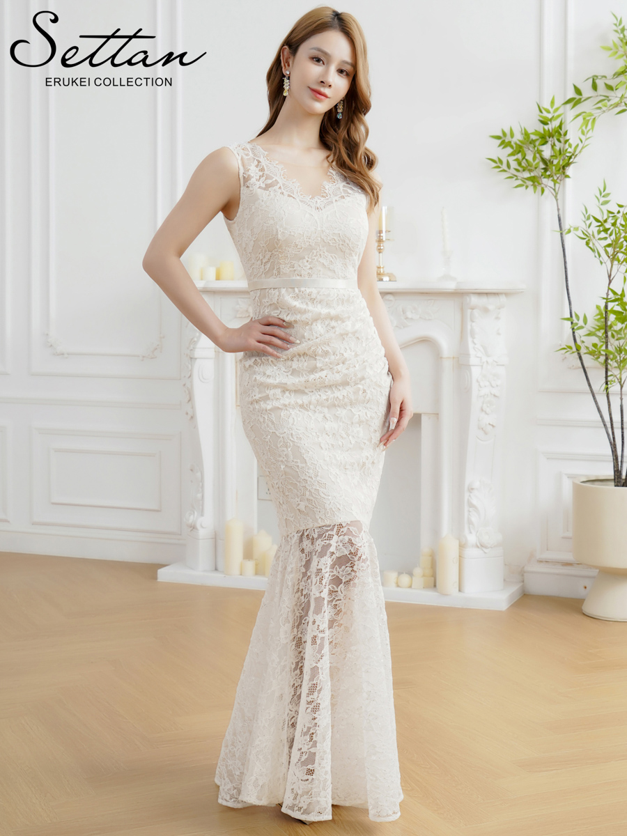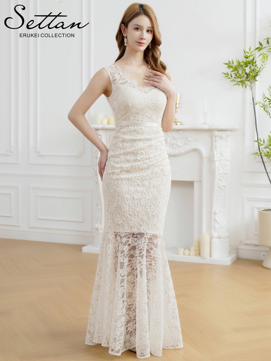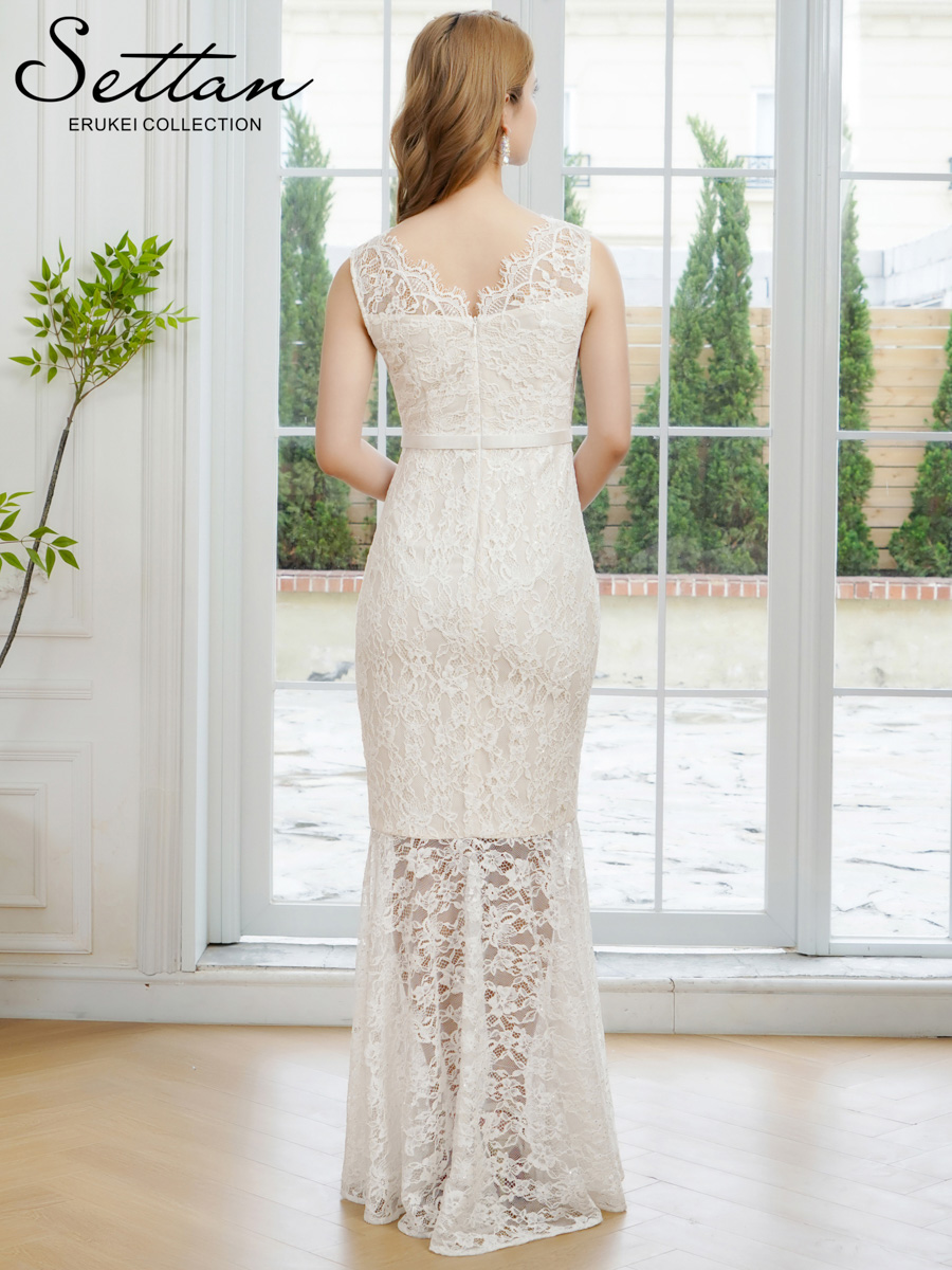 [送料無料][SETTAN]ホワイト・ネイビー・レッド・総レース・スパンコール・シアー・ギャザー・Vネック・ノースリーブ・ハイウエスト・タイト・マーメイド・ロングドレス[即日発送][大きいサイズあり]