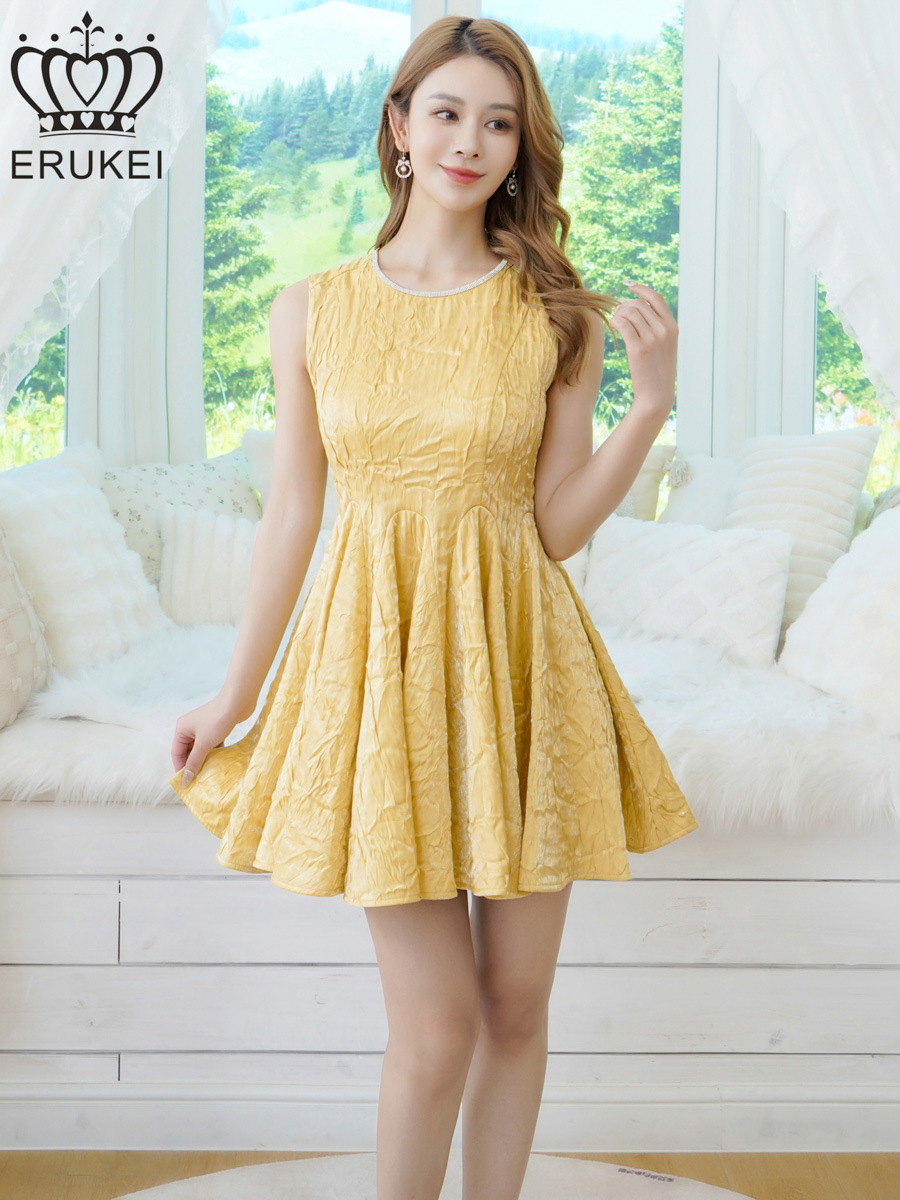 [送料無料][ERUKEI]イエロー・ホワイト・ワインレッド・ワンカラー・シャイニーサテン・シワ加工・ネックビジュー・シンプル・ノースリーブ・フレア・Aライン・ミニドレス・ワンピース[即日発送][大きいサイズあり]