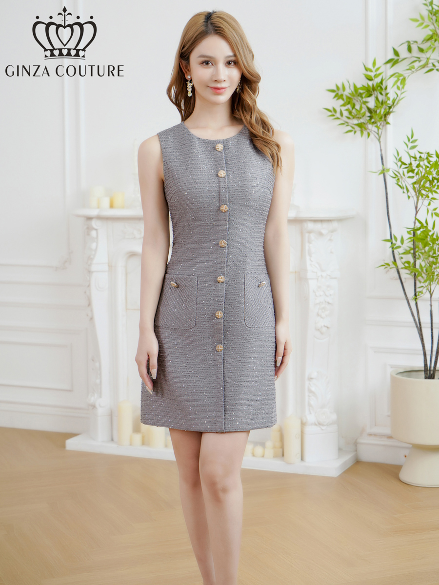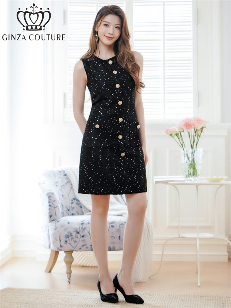 [送料無料][GINZA COUTURE]グレー・ネイビー・ワインレッド・ホワイト・ブラック・ツイード・スパンコール・ノースリーブ・ポケット・Aライン・ミニドレス・ワンピース[即日発送][大きいサイズあり]