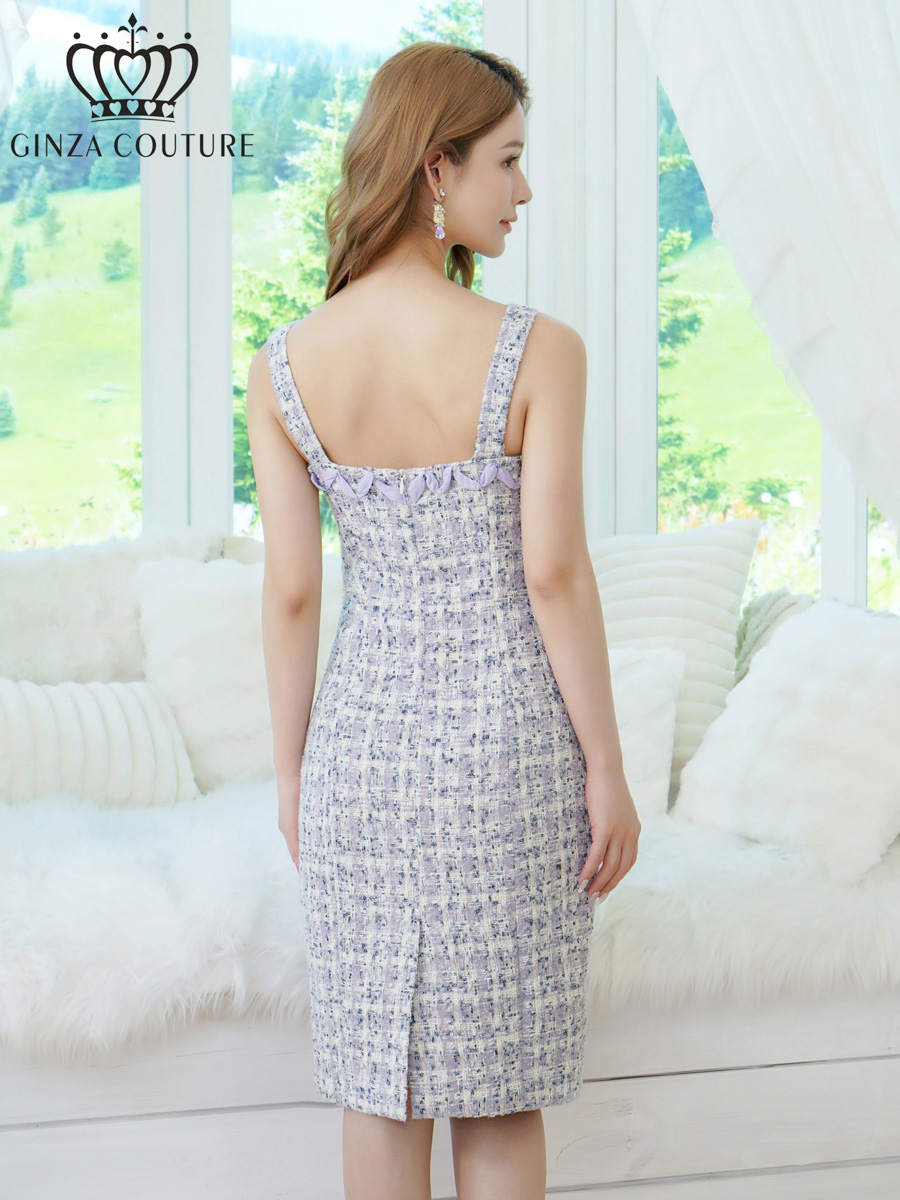 [送料無料][GINZA COUTURE]パープル・アイボリー・ノースリーブ・ツイード・リボン・ビジューボタン・ポケット・金糸・タイト・ミニドレス・ワンピース[即日発送][大きいサイズあり] [C2957]