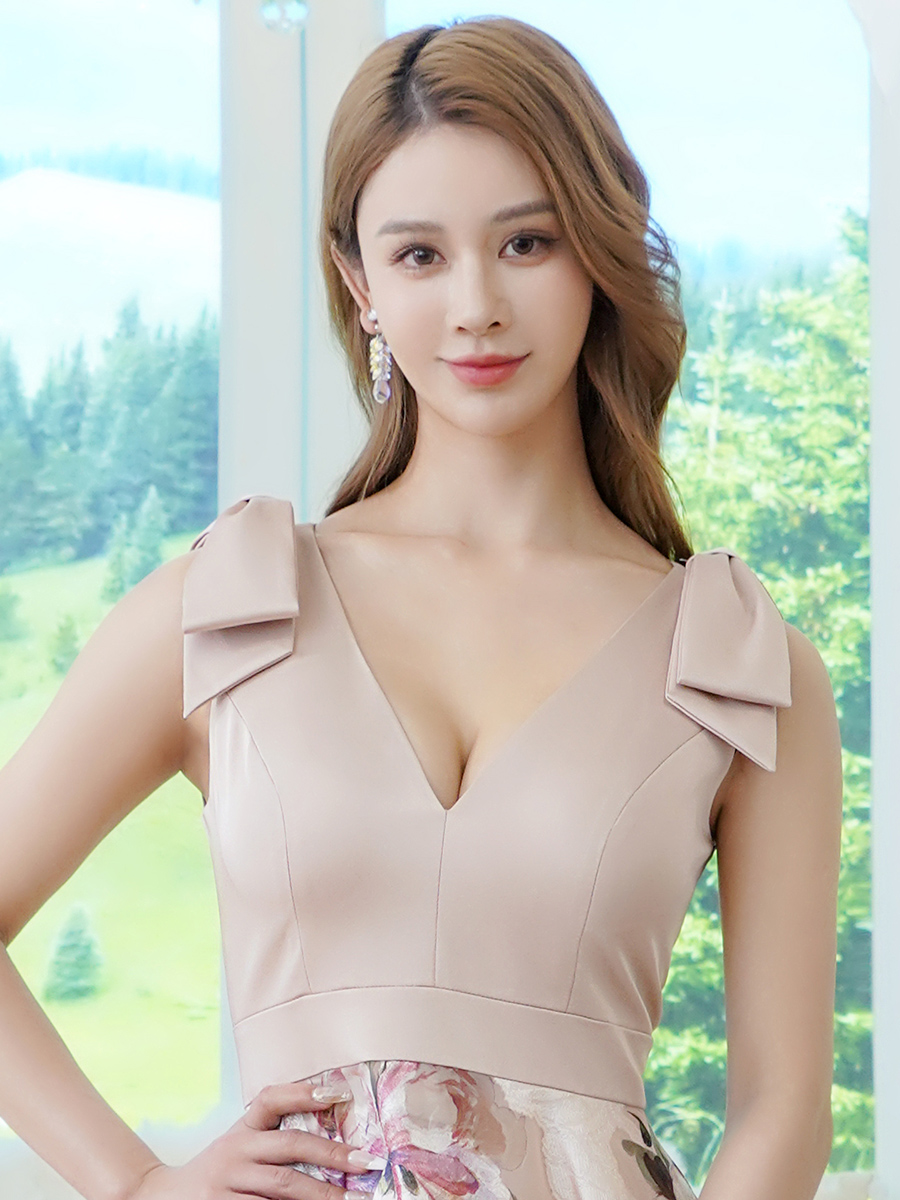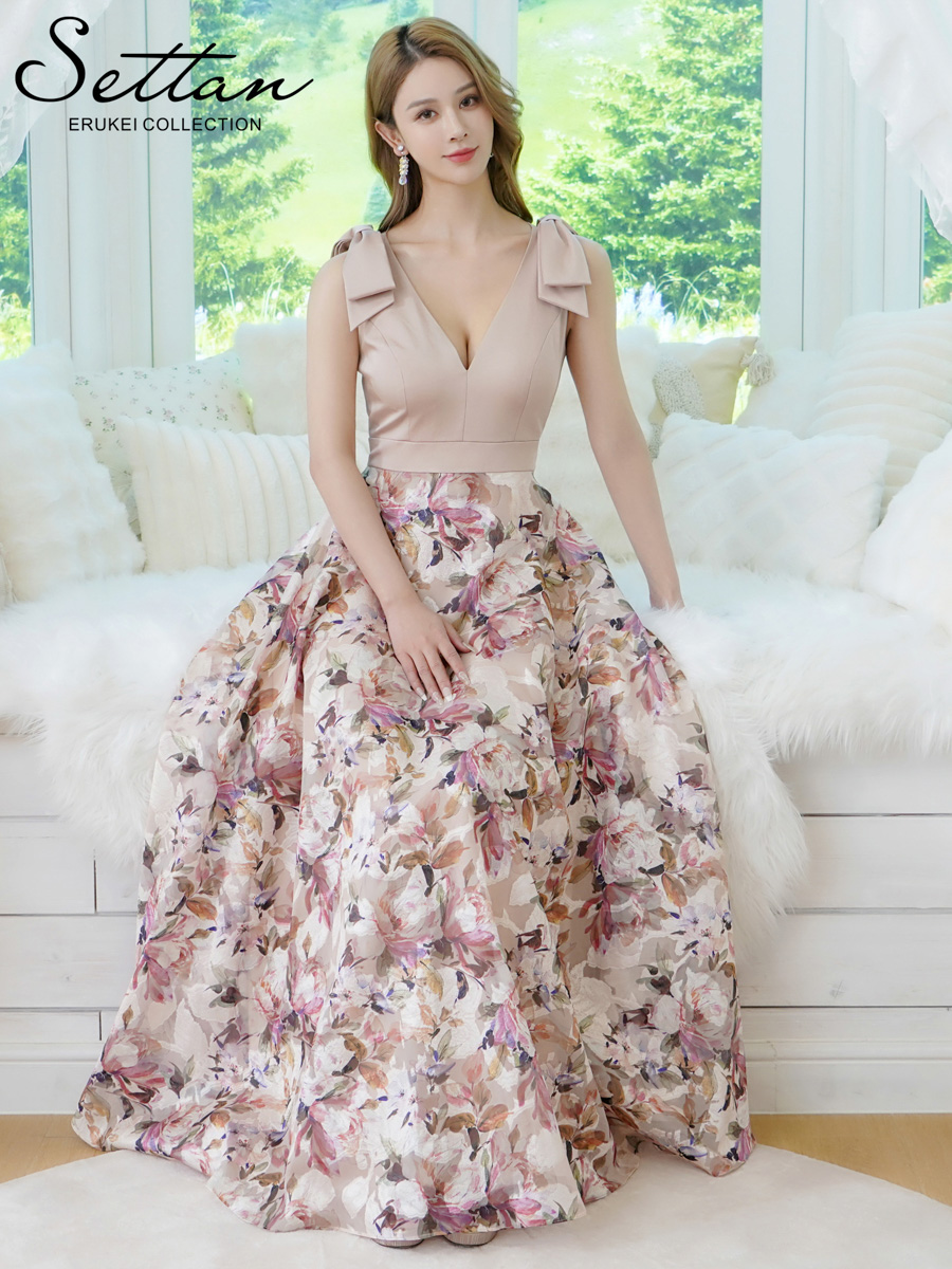 [送料無料][SETTAN]ベージュ×プリント・ヴィヴィットピンク・ライトピンク・ホワイト・プリント・オレンジ・Vネック・ノースリーブ・シンプル・サテン・上品・肩リボン・切替・Aライン・ロングドレス[即日発送][大きいサイズあり] [S25158-3]