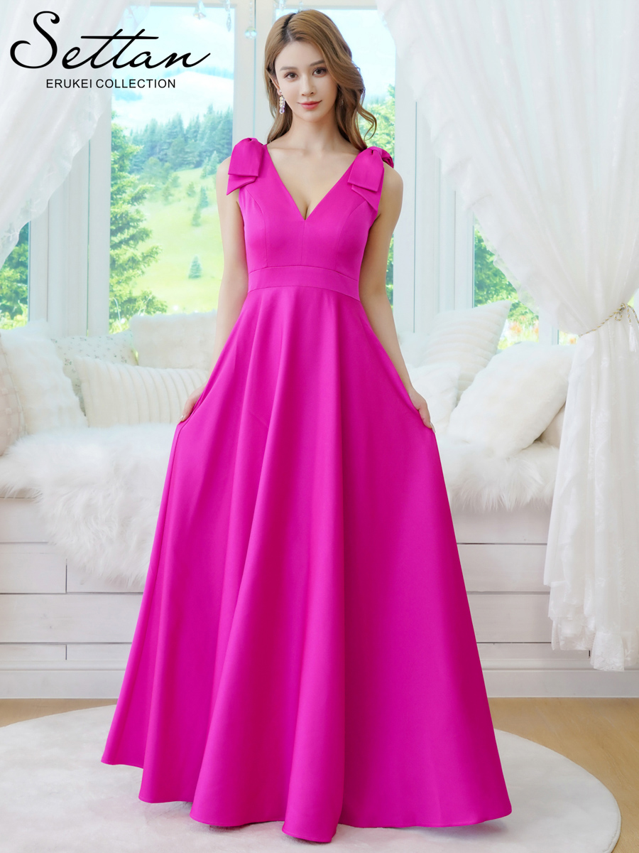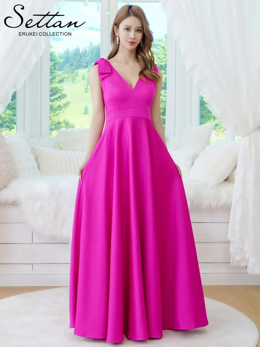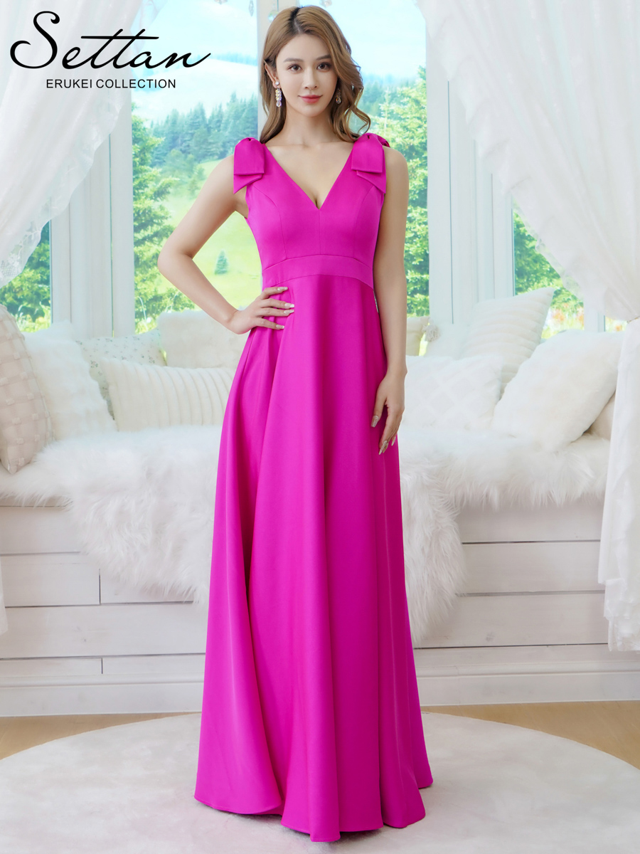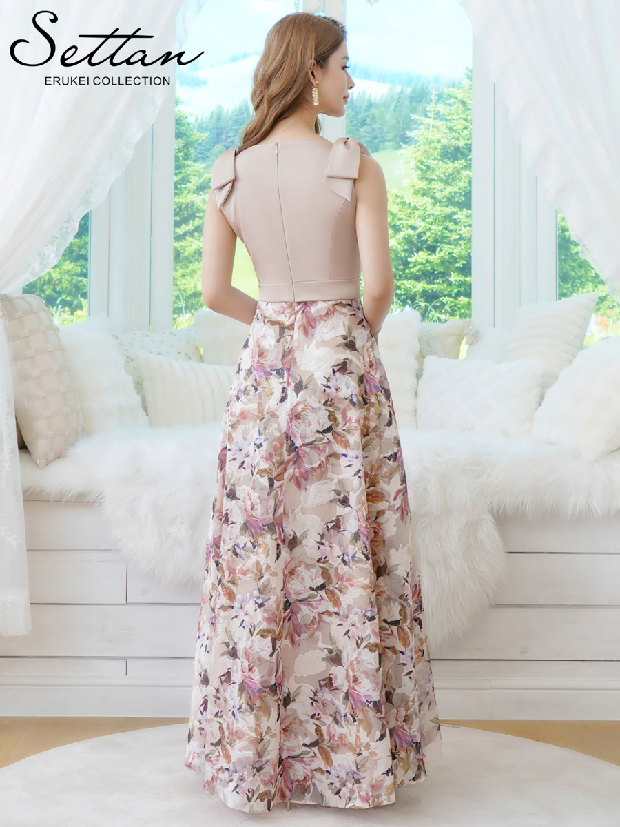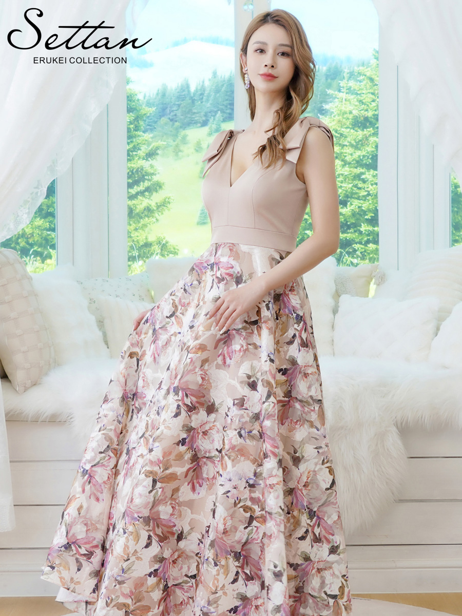 [送料無料][SETTAN]ベージュ×プリント・ヴィヴィットピンク・ライトピンク・ホワイト・プリント・オレンジ・Vネック・ノースリーブ・シンプル・サテン・上品・肩リボン・切替・Aライン・ロングドレス[即日発送][大きいサイズあり]