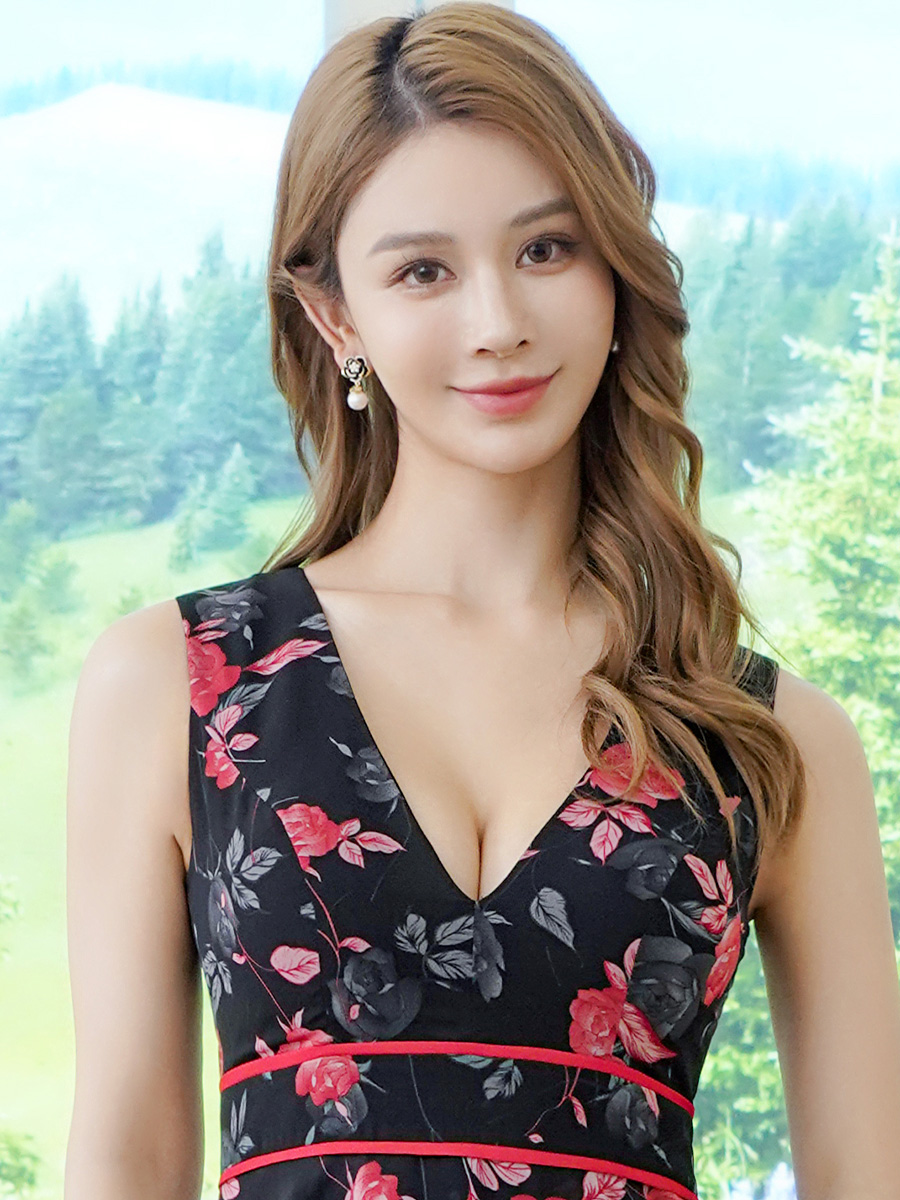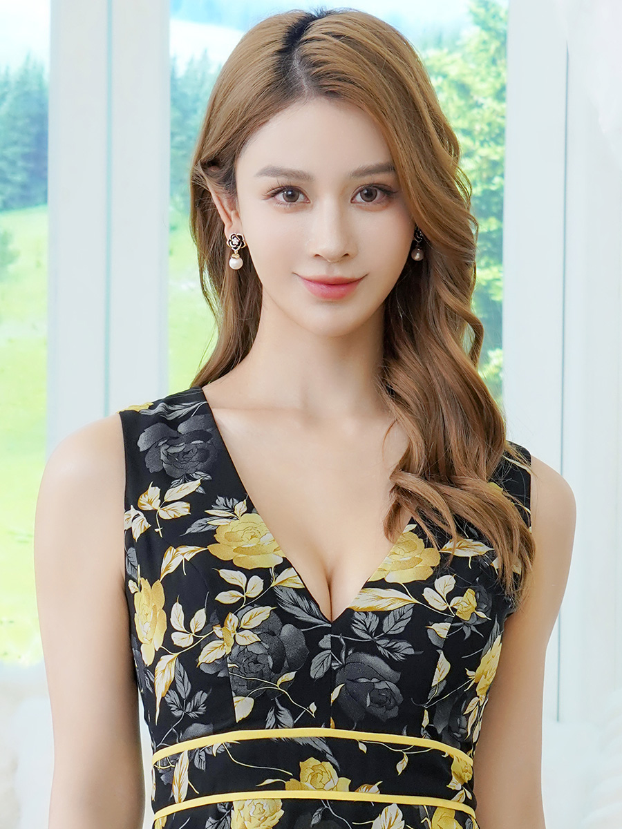 [送料無料][ERUKEI]イエロー・レッド・花柄・ノースリーブ・Vネック・ティアード・フレア・Aライン・ミニドレス・ワンピース[即日発送][大きいサイズあり] [E25125]