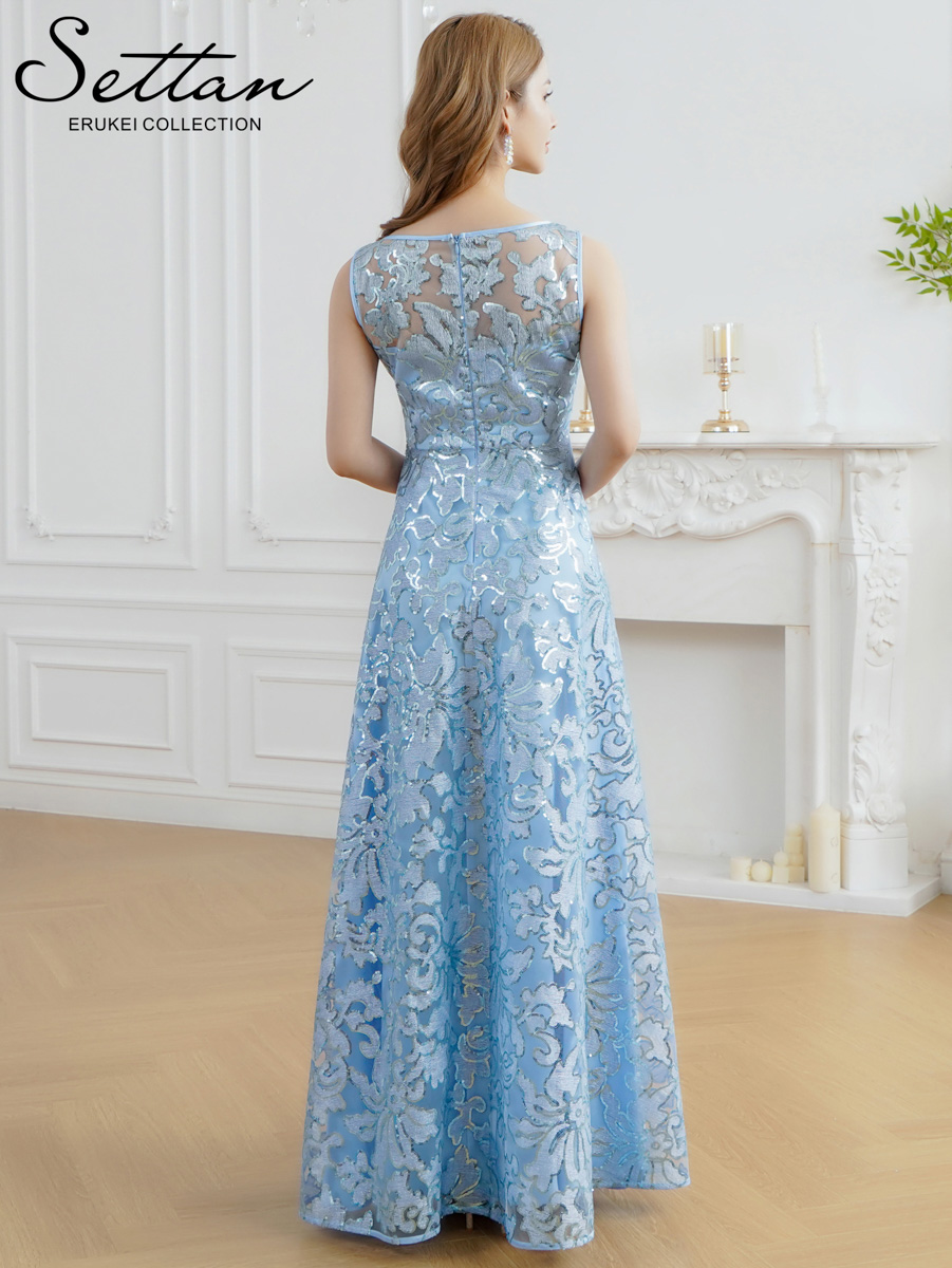 [送料無料][SETTAN]ブルー・ノースリーブ・スパンコール・レース・Aライン・ハイウエスト・ロングドレス[即日発送][大きいサイズあり]