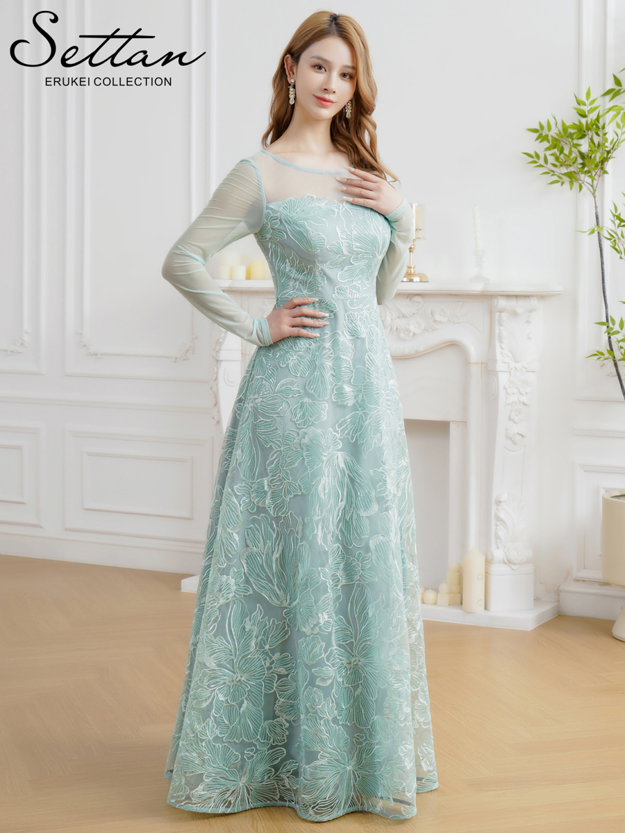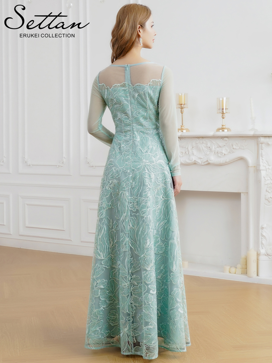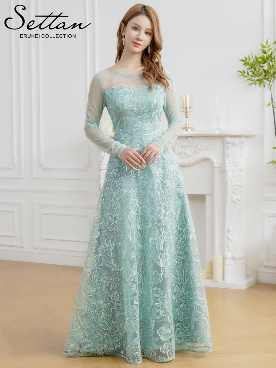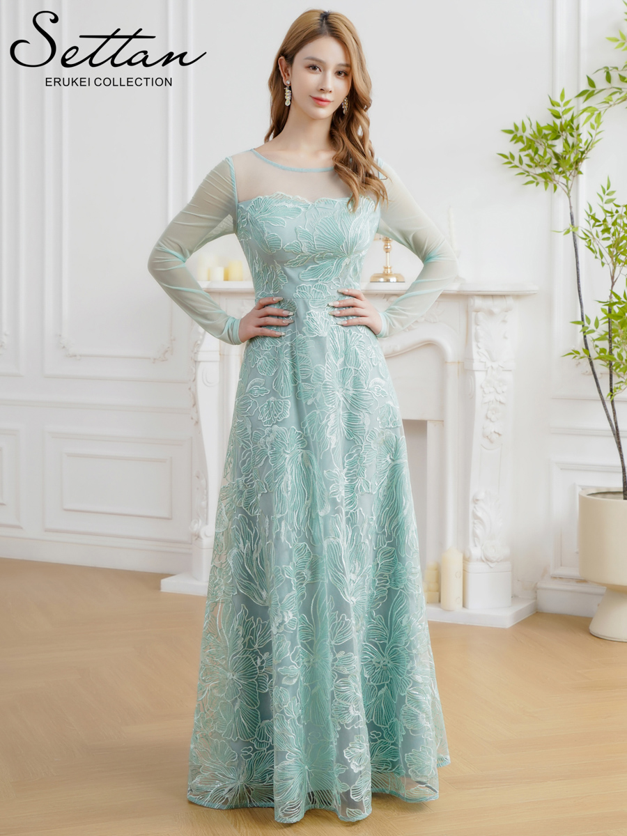 [送料無料][SETTAN]グリーン・ネイビー・花柄・シアー・チュールレース・スパンコール・長袖・ロングスリーブ・Aライン・フレア・ロングドレス[即日発送][大きいサイズあり]