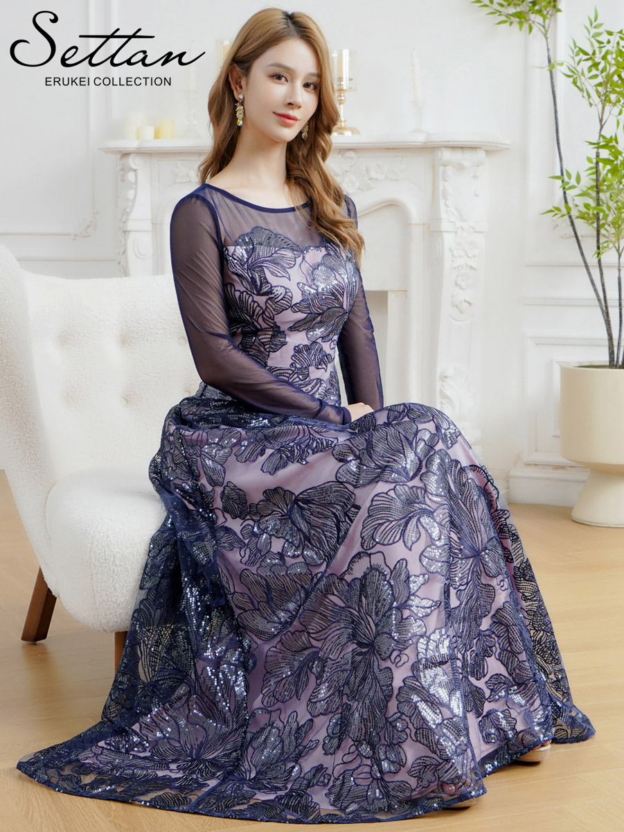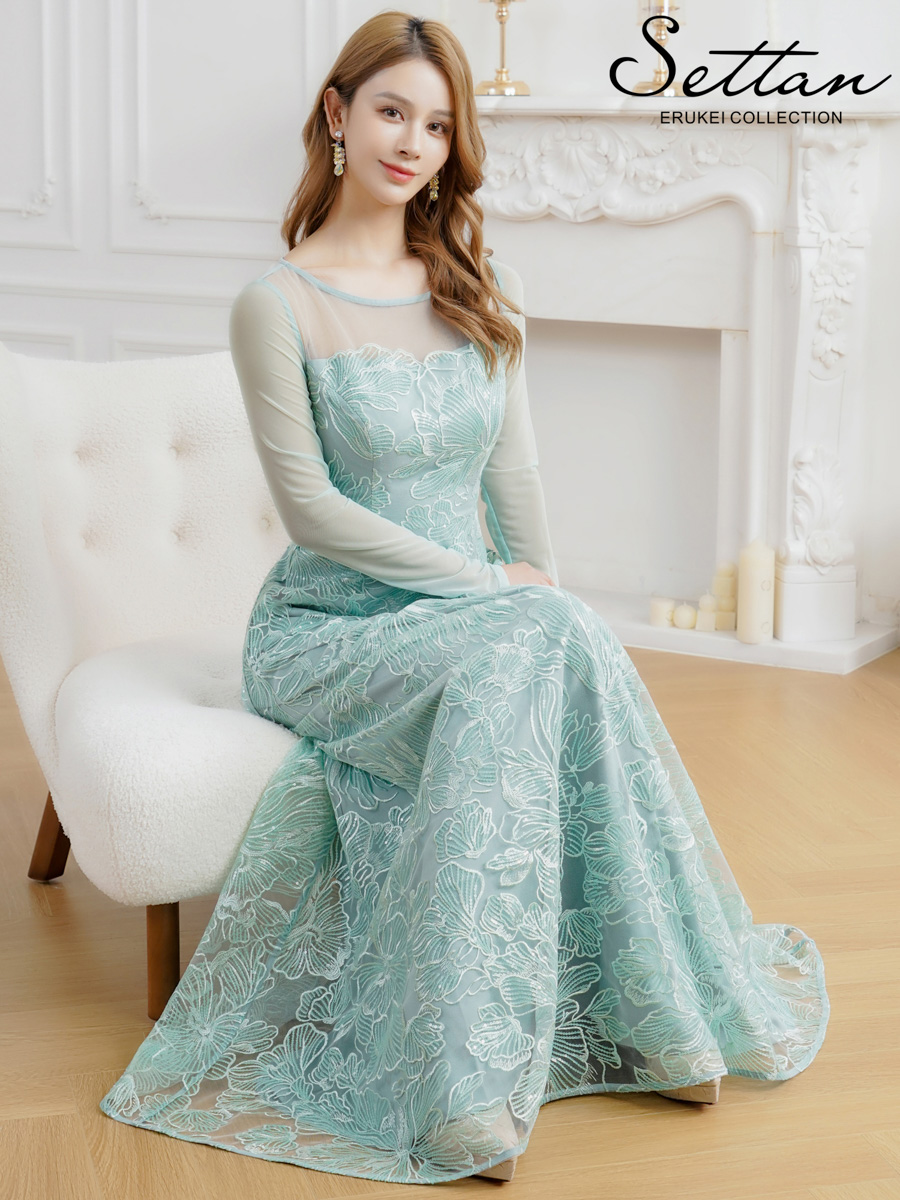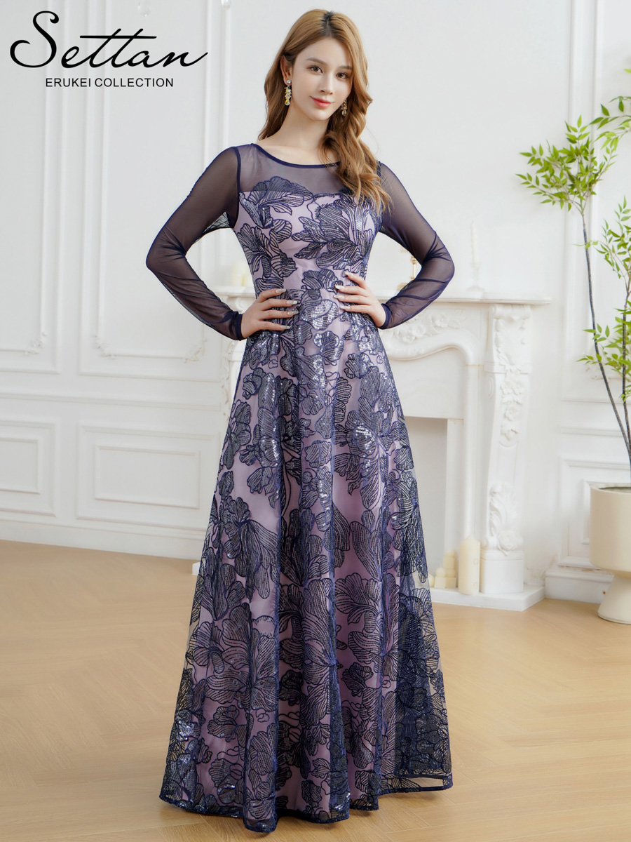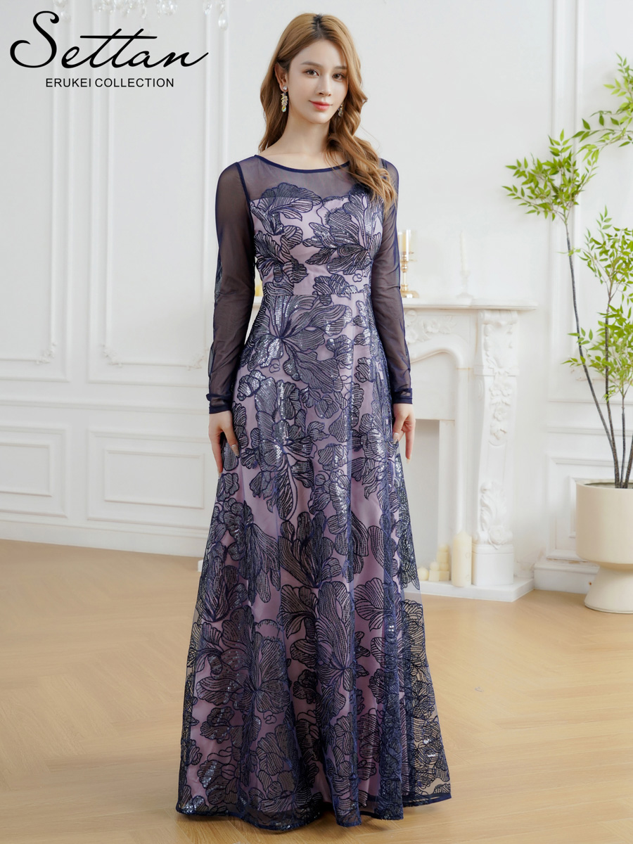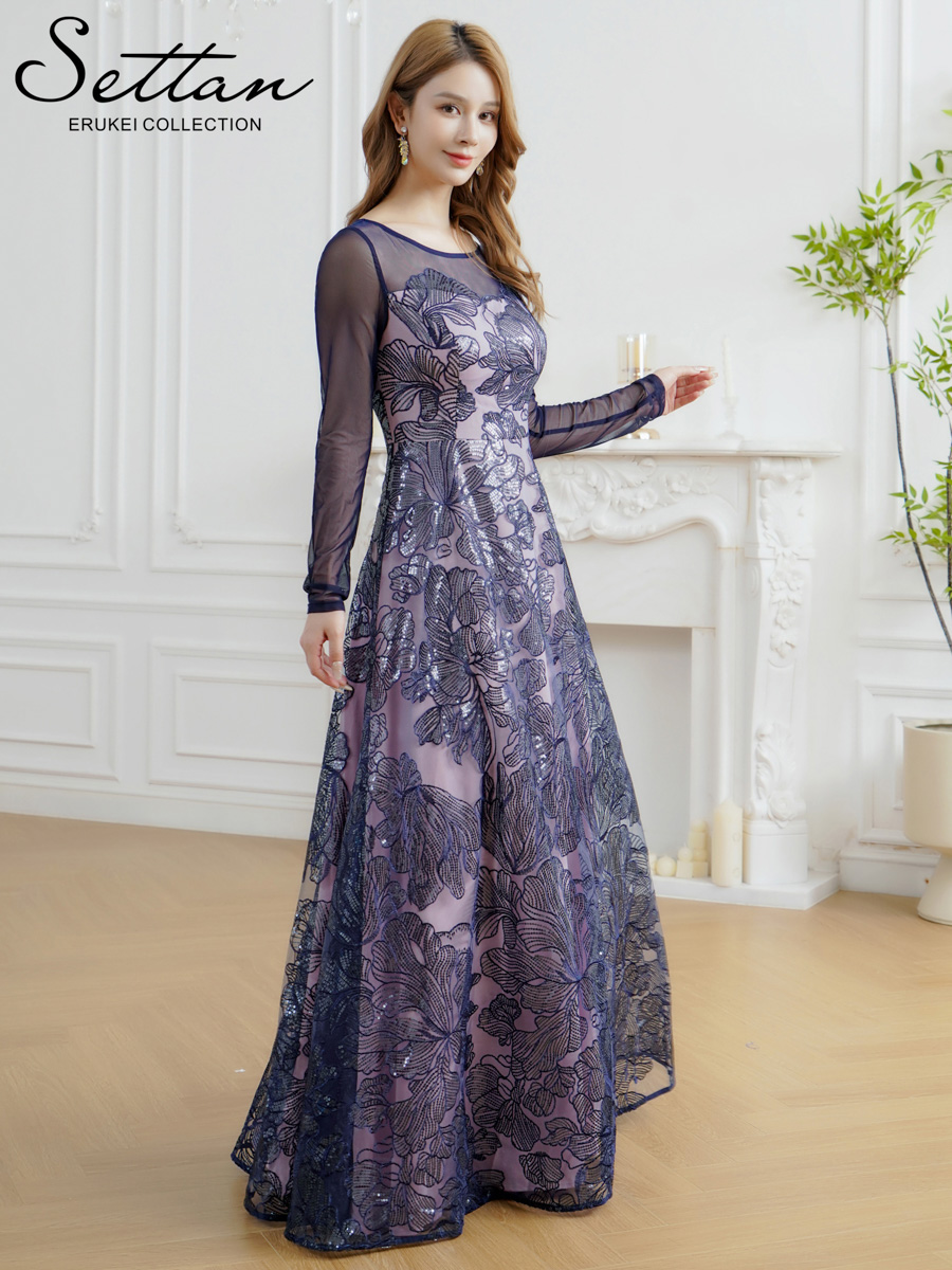[送料無料][SETTAN]グリーン・ネイビー・花柄・シアー・チュールレース・スパンコール・長袖・ロングスリーブ・Aライン・フレア・ロングドレス[即日発送][大きいサイズあり]