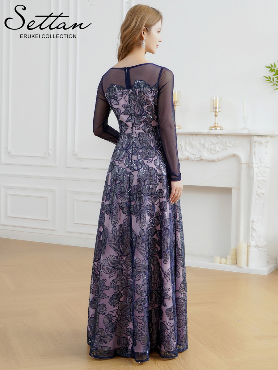 [送料無料][SETTAN]グリーン・ネイビー・花柄・シアー・チュールレース・スパンコール・長袖・ロングスリーブ・Aライン・フレア・ロングドレス[即日発送][大きいサイズあり] [S25403]