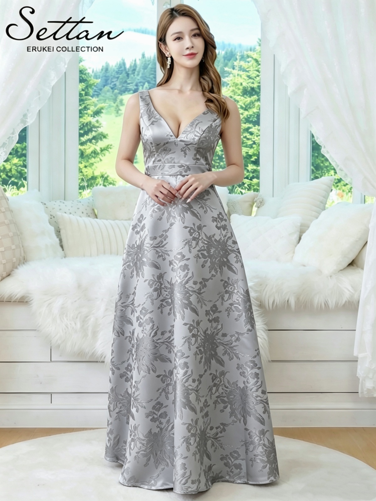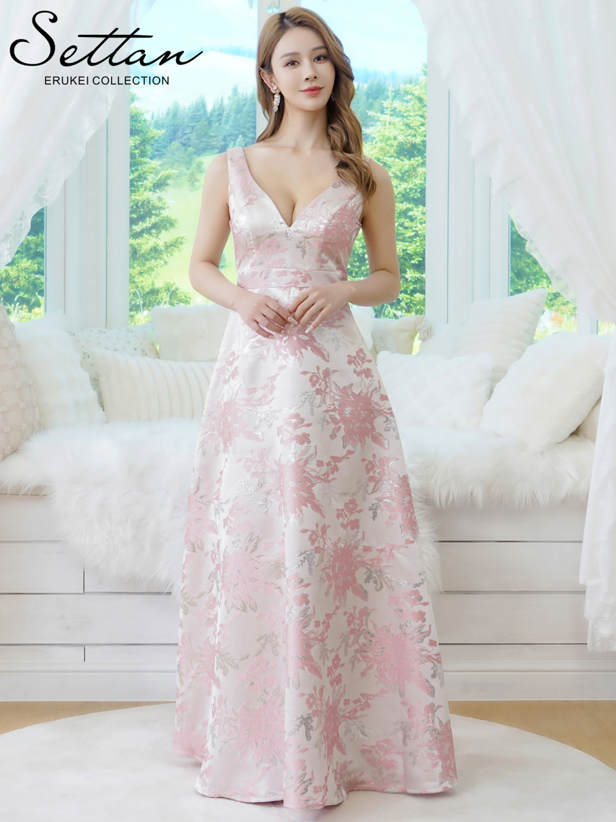 [送料無料][SETTAN]ピンク・ブラック・グレー・ジャガード・花柄・金糸・Vネック・ハイウエスト・ノースリーブ・フレア・Aライン・ロングドレス[即日発送][大きいサイズあり] [S26004]