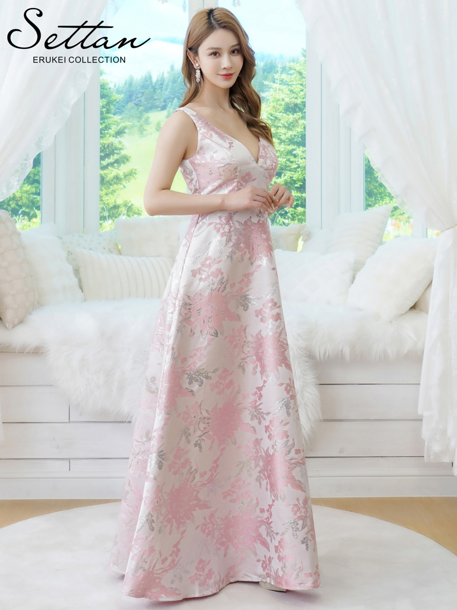 [送料無料][SETTAN]ピンク・ブラック・グレー・ジャガード・花柄・金糸・Vネック・ハイウエスト・ノースリーブ・フレア・Aライン・ロングドレス[即日発送][大きいサイズあり]