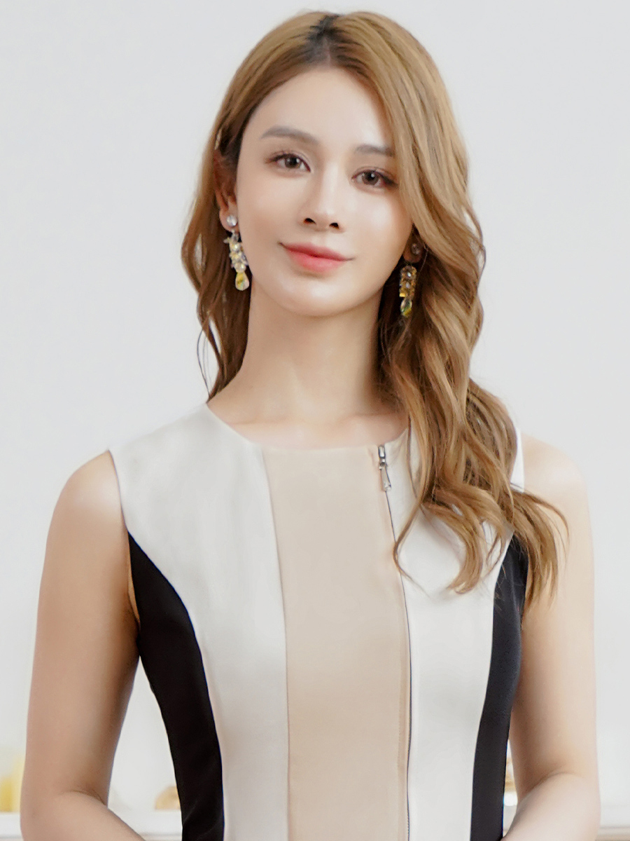 [送料無料][ERUKEI]ベージュ×ホワイト・トリコロールカラー・フロントジップ・ノースリーブ・タイト・マーメイド・ミディアムドレス・ワンピース[即日発送][大きいサイズあり] [E25138]