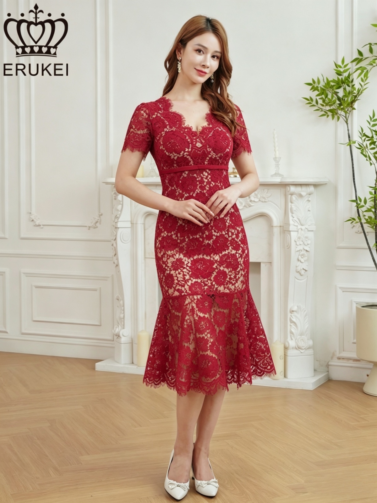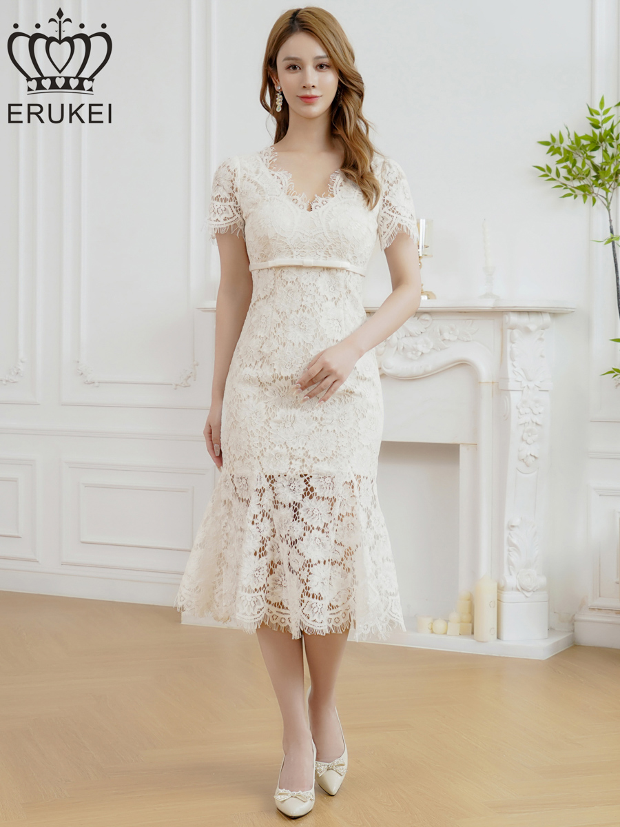 [ERUKEI]ホワイト・レッド・ワンカラー・総レース・フリンジ・半袖・インナーミニ・タイト・マーメイド・ミディアムドレス・ワンピース[即日発送][大きいサイズあり] [E25294]