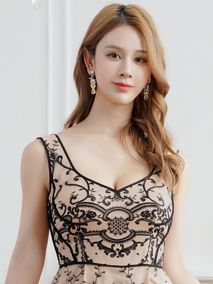 [送料無料][SETTAN]ベージュ・チュールレース・クラシカル・ノースリーブ・・ハイウエスト・フレア・Aライン・ロングドレス[即日発送][大きいサイズあり] [S26012]
