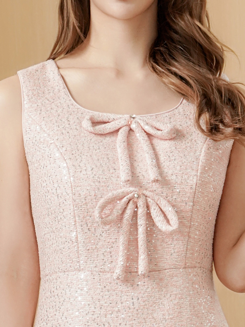 [送料無料][ERUKEI]ピンク・ツイード・リボン・スパンコール・フレア・Aライン・ノースリーブ・ミニドレス・ワンピース[即日発送][大きいサイズあり]
